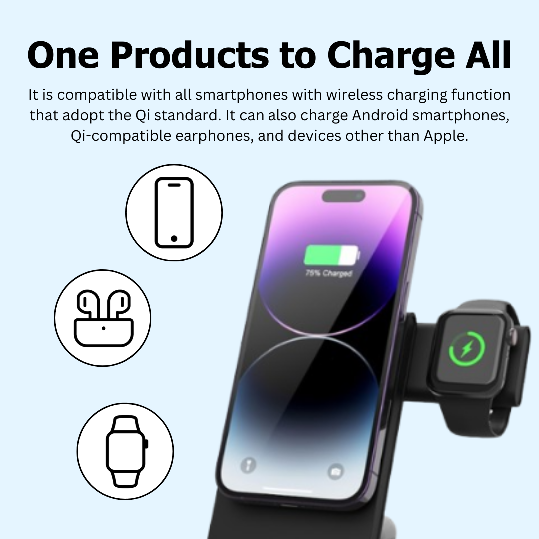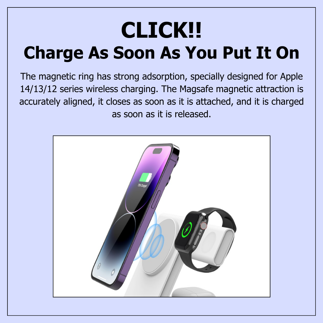 Introducing the 3-in-1 Charger, your all-in-one charging solution! This ultra-thin, versatile charger is designed for on-the-go use, at your desk, or anywhere you need quick, reliable power. With its sleek design and convenient functionality, it’s perfect for charging your devices with ease while keeping them in view.